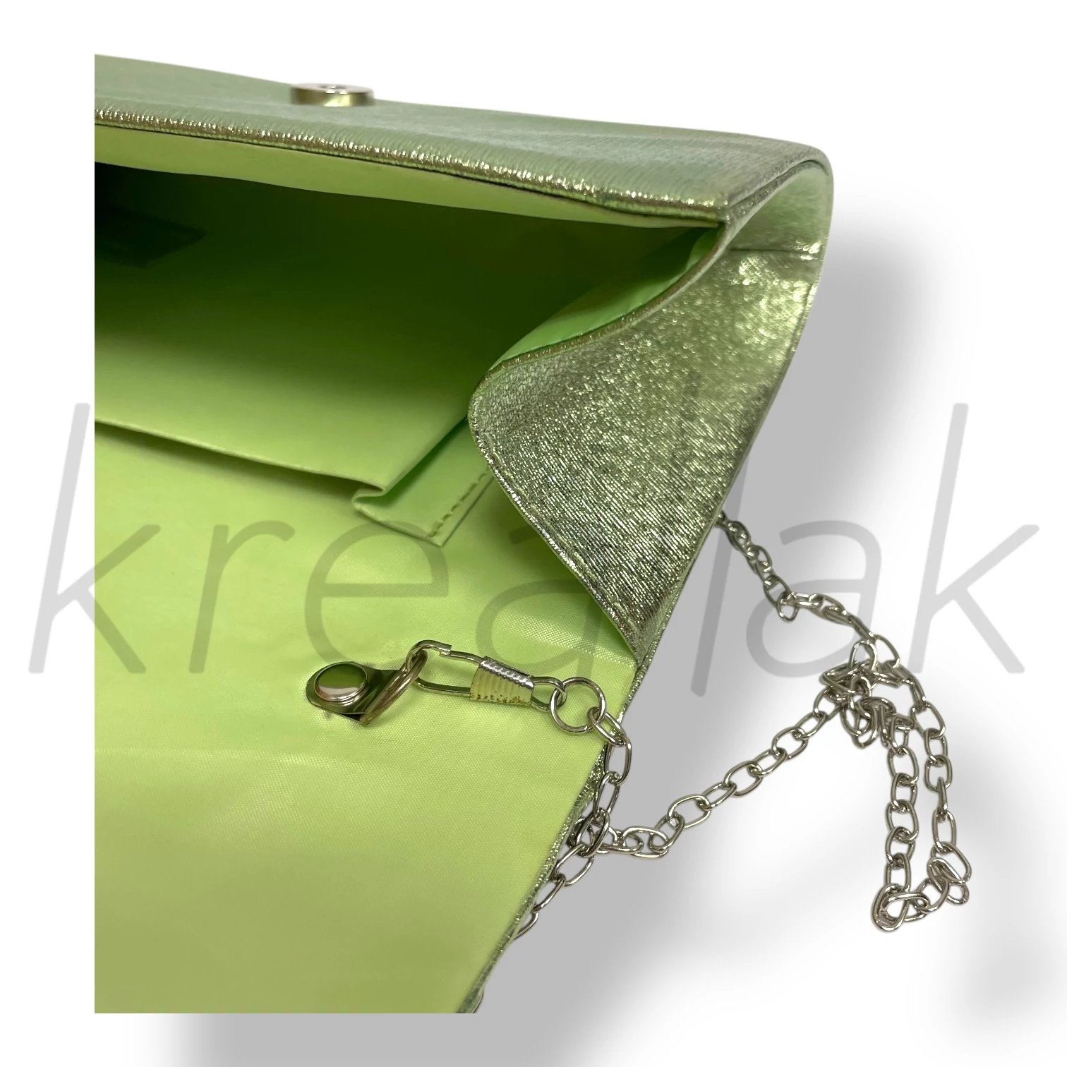 Az almazöld alkalmi táska igazán jó választás alkalmakra. Fényes műbőr anyagai igazi alkalmi hangulatot ad. Feltűnő és trendi színével dobja fel megjelenésed. A táskának vékony láncos pántja van , belül egy kis zsebbel. Ha szeretnél kitűnni egyedi darabbal,akkor ez táska a tökéletes választás.