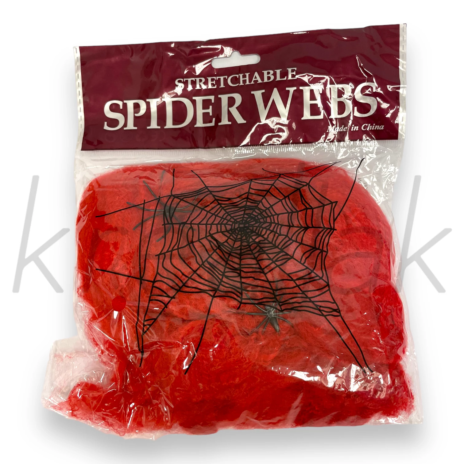 Puha vattaszerű piros háló, fekete pókokkal. Kül- és beltéri dekorációhoz egyaránt alkalmas.