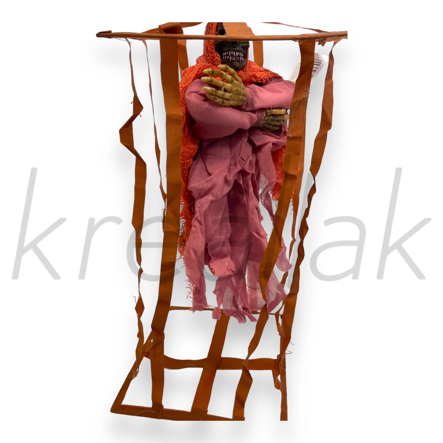 A dekoráció 55 cm magas , a keret textilből van , a csontváz műanyag textil kiegészítőkkel.
