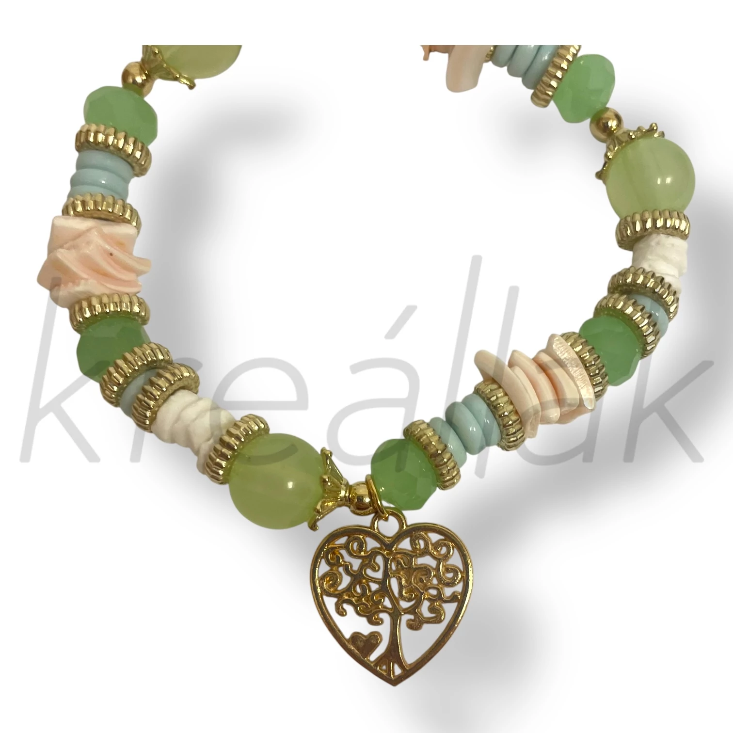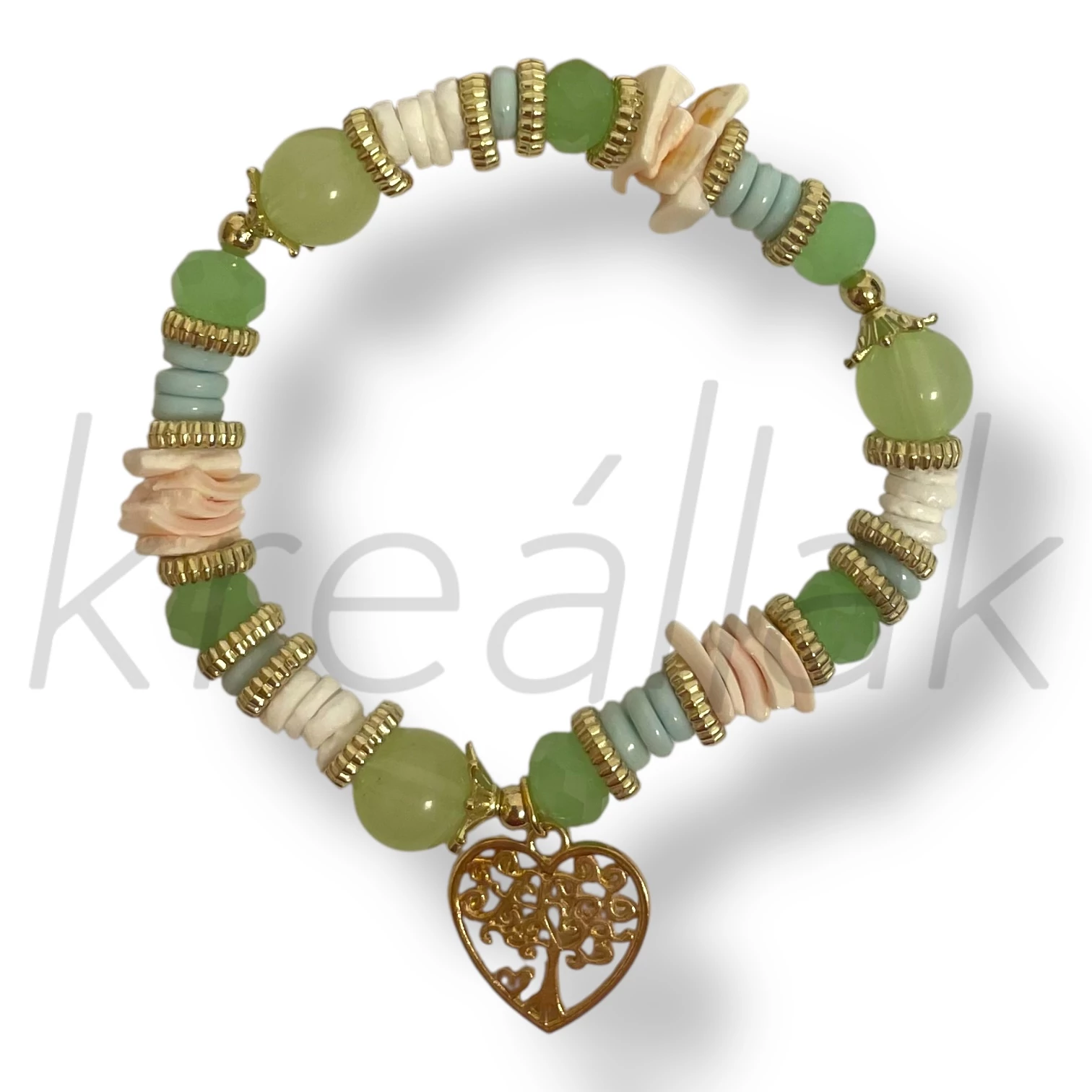 zöld gyöngy életfa szív karkötő